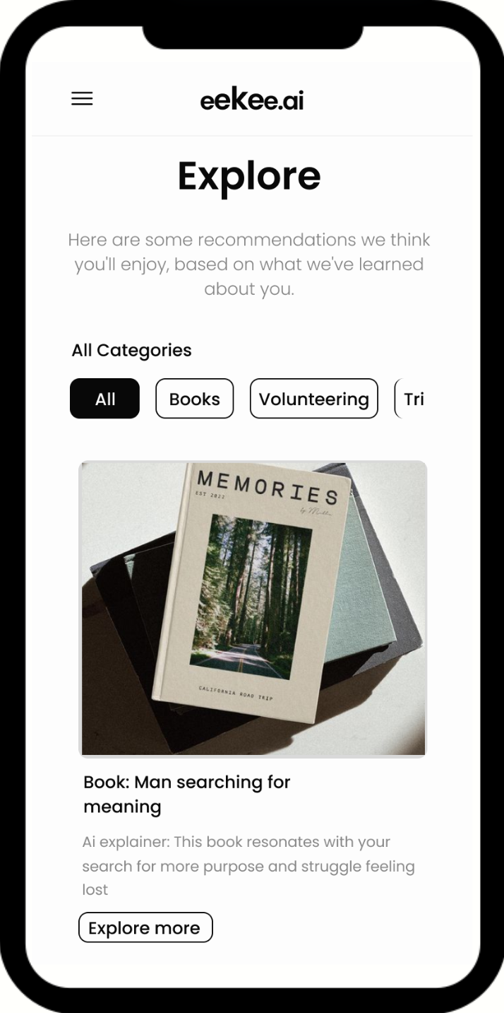 Based on your sessions with eekee, we match you with purpose-aligned resources beyond work, such as books or volunteering.